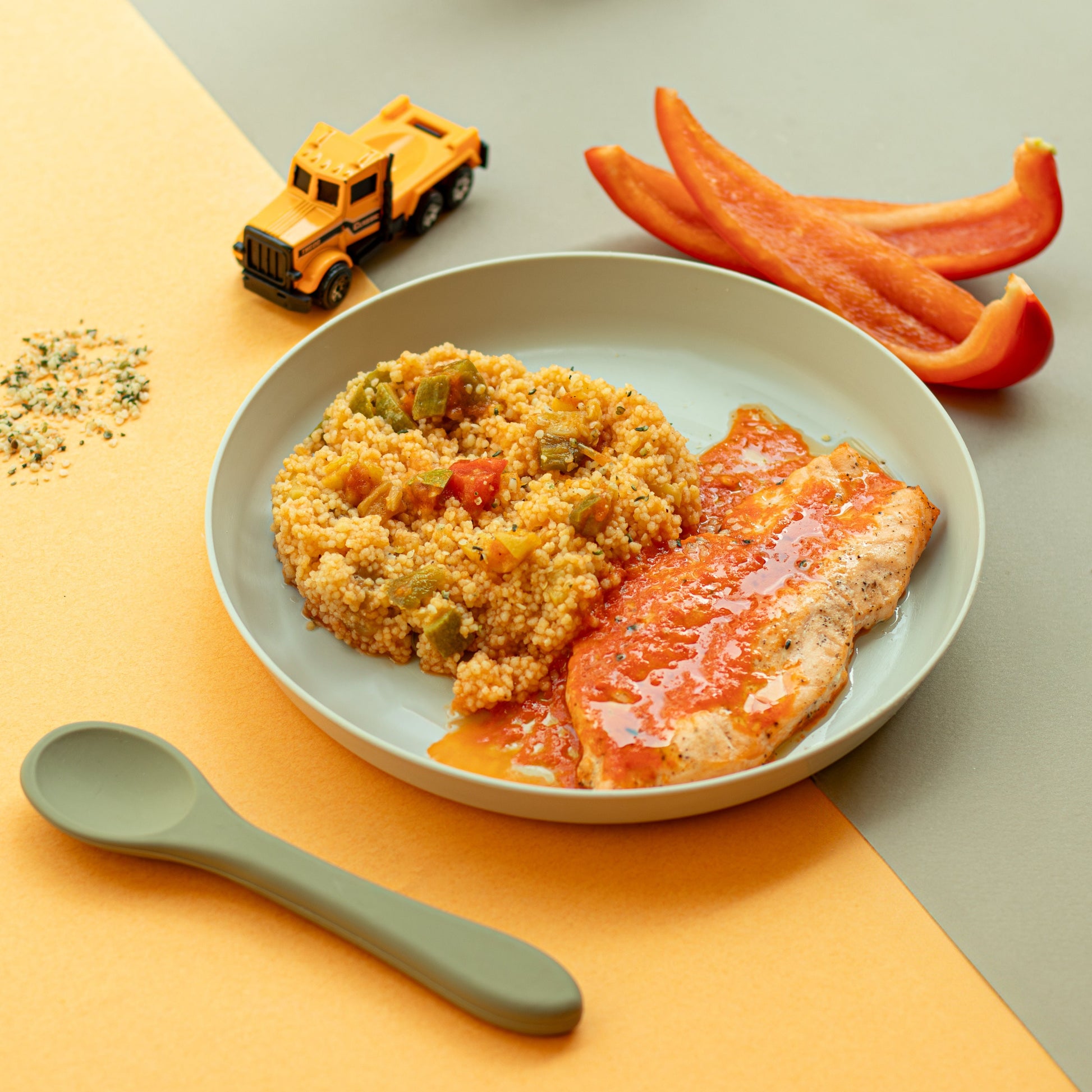 Ingredients: salmon, fish broth, couscous, bell pepper, zucchini, carrot, onion, butter, lemon, paprika, cumin